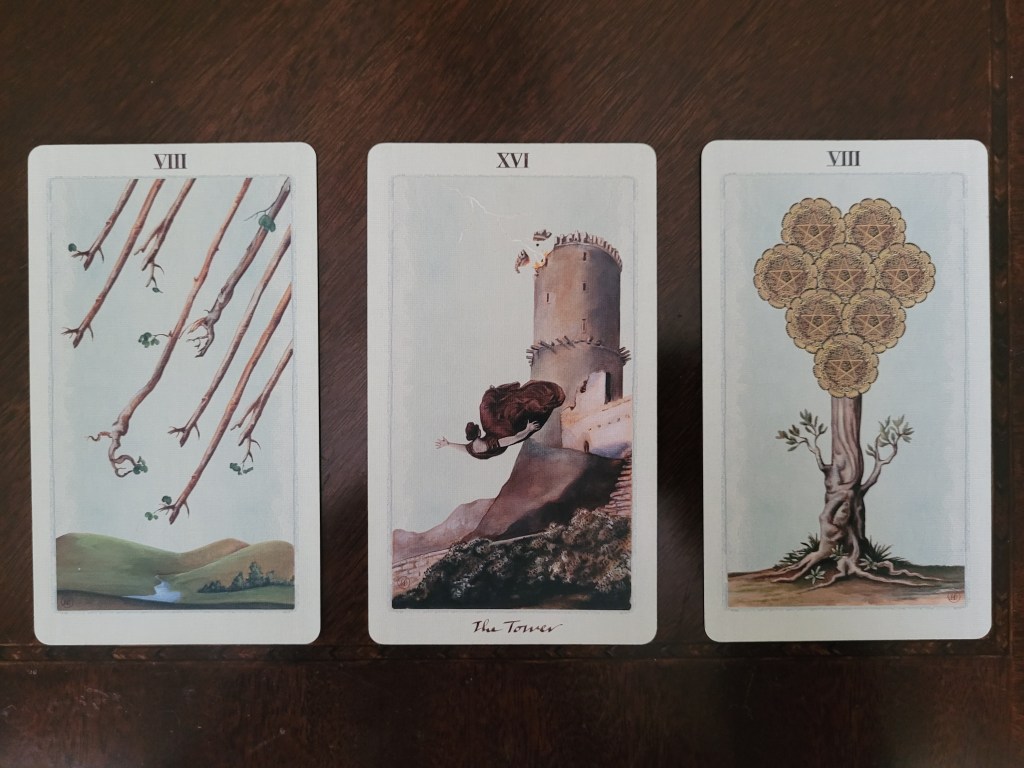 The Tower, a Major Arcana (center): “This is the card where chaos lives” says the author. It is about uncertainty, chaos, great sudden change, and “adversity”.