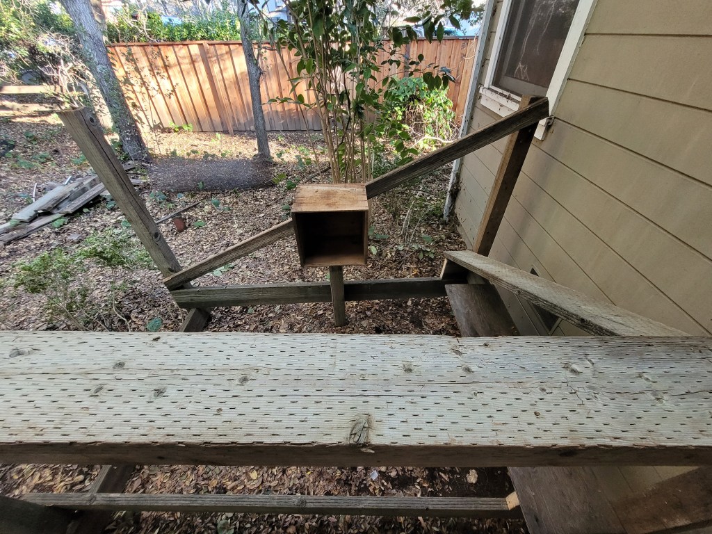 In the pictures, you can see our progress: (1) setting the posts; (2) adding structual reinforcements; (3) building a ramp, box, and steps; (4) attaching the fencing and an extra little seat.
