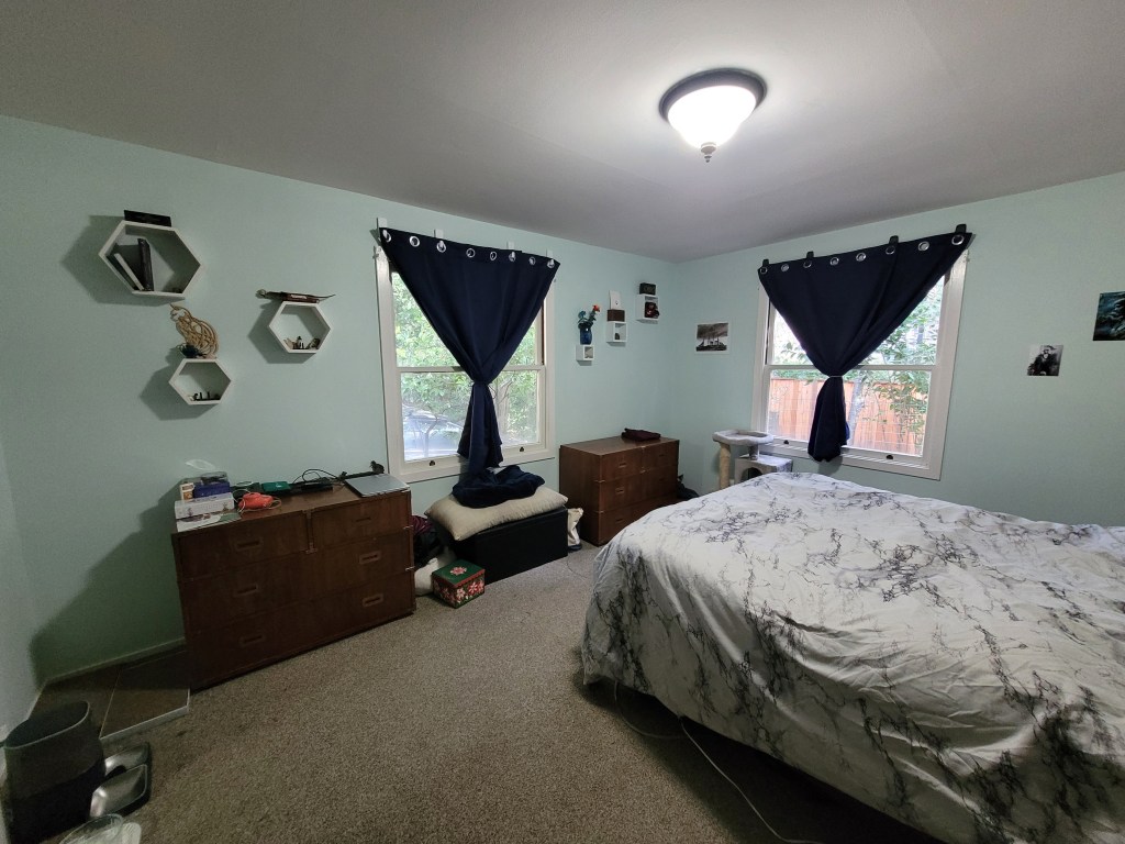 When we moved last July, we painted the bedroom to cover up the damage on the walls and add more of our vibes. The sea foam green with white trim is a vast improvement to the previous orange-tinted cream with yellow trim. That process took so long and so much energy that we put off the rest of our plans of shelving and art on the walls until now.