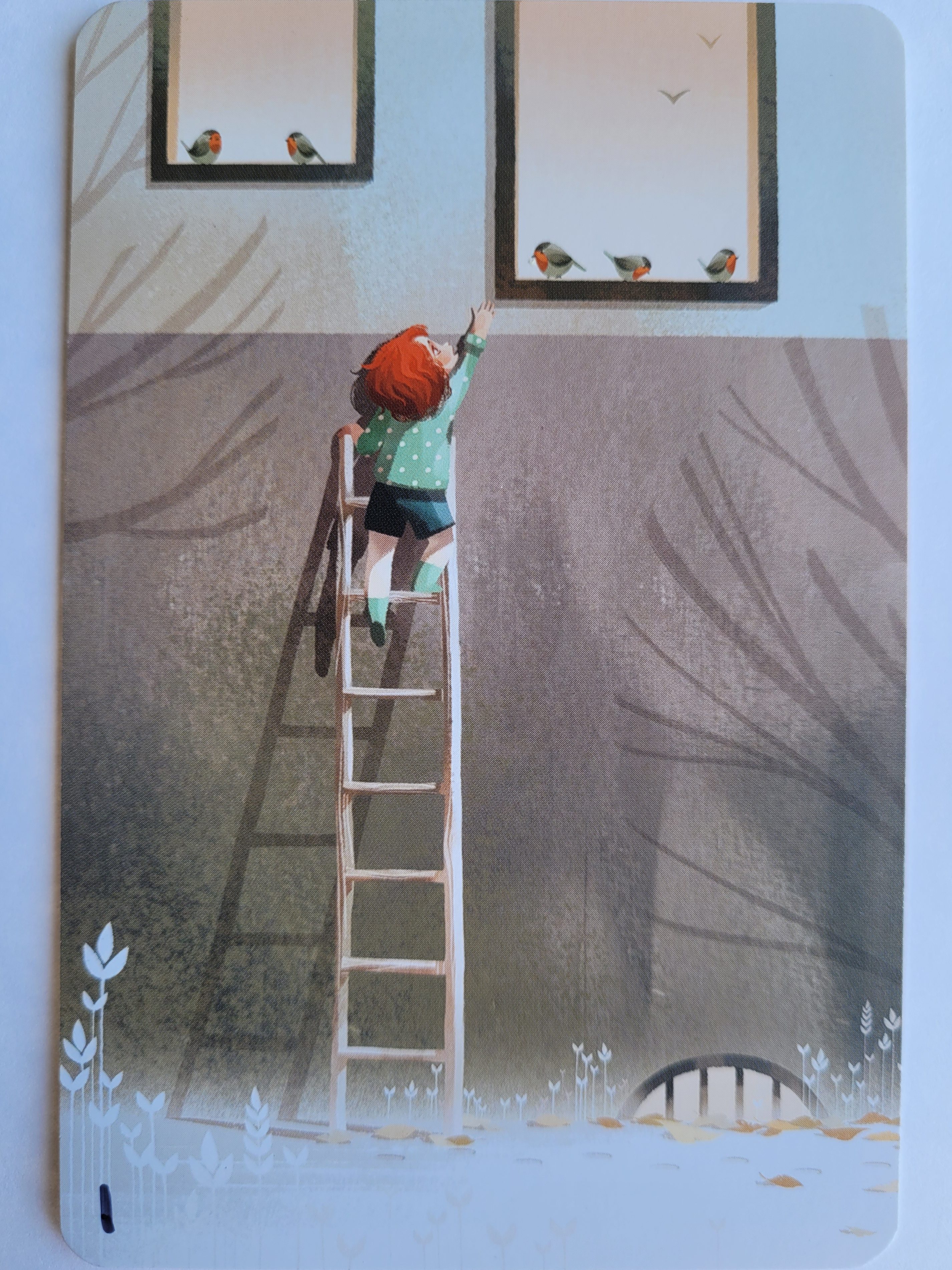 The windowsill was far above her head. She wanted to touch the bird, to let it know she was its friend, so she searched the grounds for an answer. To her satisfaction, she spotted a ladder leaning against the warehouse that the workmen must have forgotten about. It wasn’t placed quite right, and she didn’t think she could move it. But maybe if she climbed to the top of it and leaned out toward the bird, it would be close enough for it to see her as a friend.