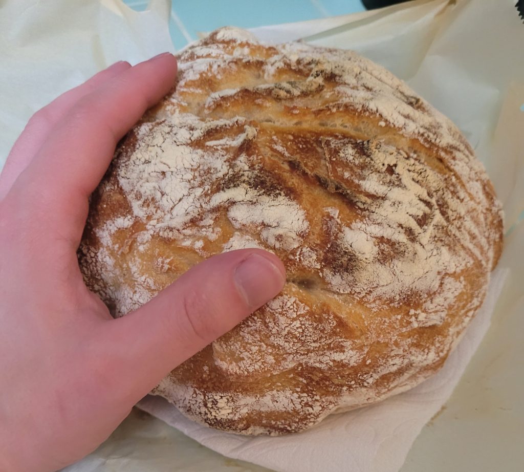 I use a simple recipe that requires almost no kneeding. I mix it in the morning, let it rest for 1-2 hours, fold it, rest and fold it a second time, and proof it until after dinner. Then I bake it in our cast iron dutch oven.